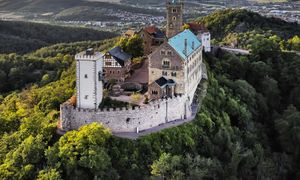 Potężny zamek wznosi się nad miastem. Z murów piękne widoki na wzgórza