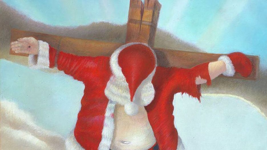Obraz pojawił się przed katedrą św. Patryka w Nowym Jorku. Widać na nim Mikołaja ze spuszczoną głową, który wisi na krzyżu. Pod nim znajduje się mnóstwo świątecznych prezentów.