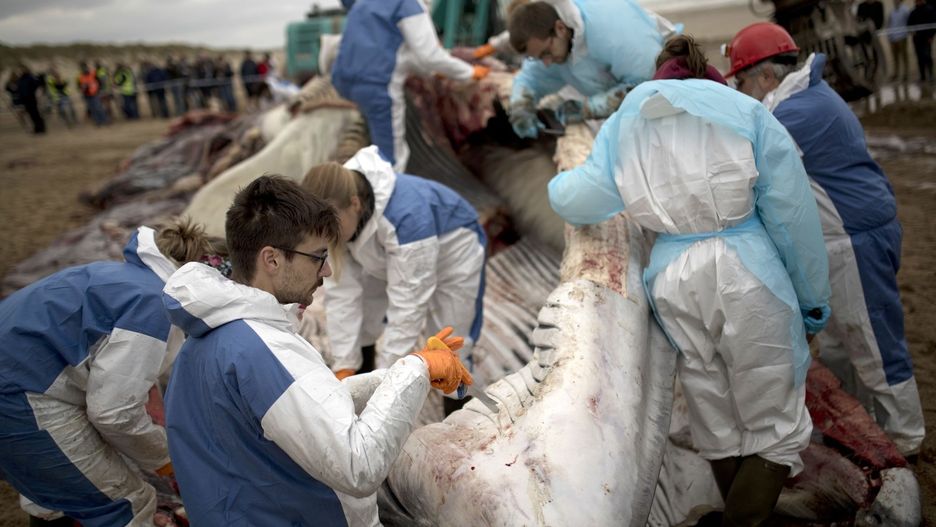 Grzbiet morskiego ssaka rozcięto. Po śmierci wielorybów, pod grubą warstwą tłuszczu zaczynają gromadzić się gazy. Jeśli nie znajdą one ujścia, może dojść o rozerwania zwierzęcia.