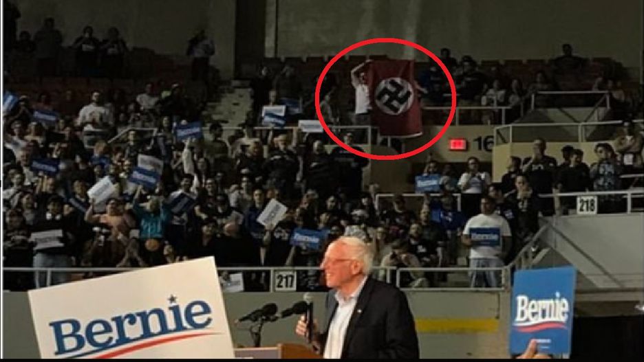 Bernie Sanders przemawiał. Na widowni flaga III Rzeszy