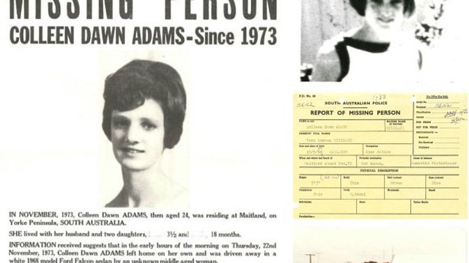 *Mąż pani Adams, Geoff, powiedział policji, że kiedy obudził się rano 22 listopada 1973 r. jego żona była już spakowana. * Według jego zeznań kobieta powiedziała, że wyjeżdża i zostawia rodzinę. Później wsiadła do samochodu z kobietą w średnim wieku, której nie znał.
