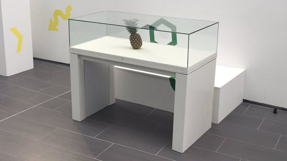 Obsługa wystawy najwyraźniej uznała, że ananas jest częścią ekspozycji. Owoc został więc przykryty szklaną gablotą.