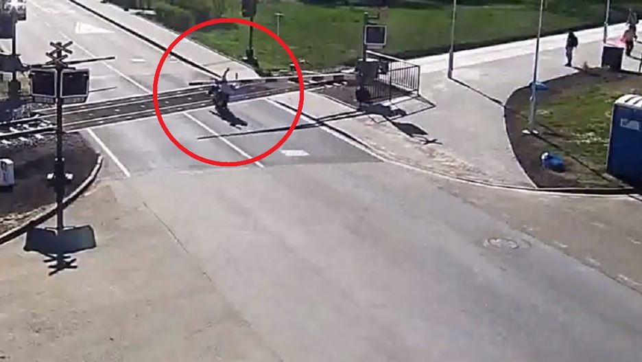 Motorowerzysta uderzył głową prosto w szlaban i spadł z pojazdu prosto na tory. Policja z Czech opublikowała wideo z zapisem dramatycznych wydarzeń na przejeździe kolejowym w mieście Kostelec nad Orlicí. Gdyby nie mężczyzna czekający na pociąg, motorowerzysta mógł skończyć pod kołami składu.