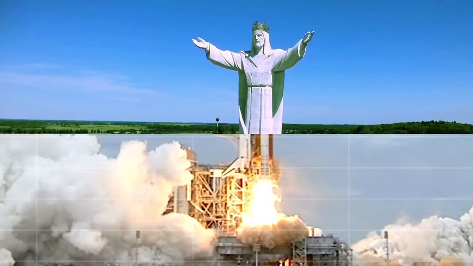W całym wideo zestawiane są ze sobą z pozoru niepasujące rzeczy. Naszego Jezusa doczepiono do promu kosmicznego.