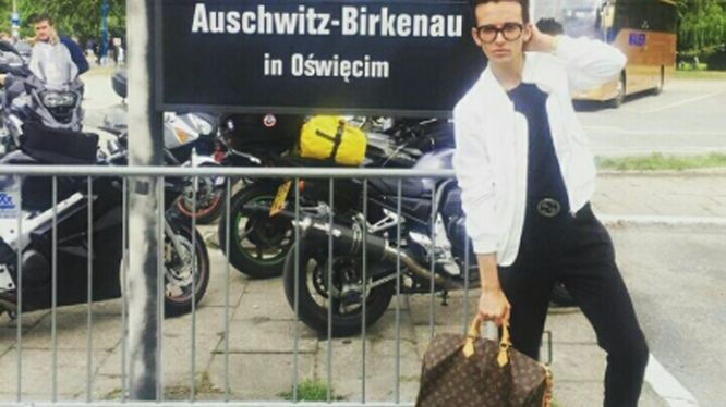 Dziwna poza, nóżka akrobatycznie wygięta, rąsia ku górze, po prostu cudne zdjęcie na blogaska oraz na Instagrama. Lajki same lecą. Najgorsze jest zdjęcie na torach kolejowych prowadzących do obozu w Auschwitz. Biała kurteczka, adidaski też białe, torba Louis Vuitton, paseczek Gucci… A w tle obóz śmierci. Idealne tło dla marek za zyliard. Brawo. Ach, jestem taki śliczny, modny i mam taką cudną, markową i modną torebunię, to sobie ją pokażę na luzaku w miejscu, gdzie zamordowano 6 milionów ludzi. A co tam. Zrobię hastag #fashionvictim #LVaddiscted i #influencer. Będzie super.