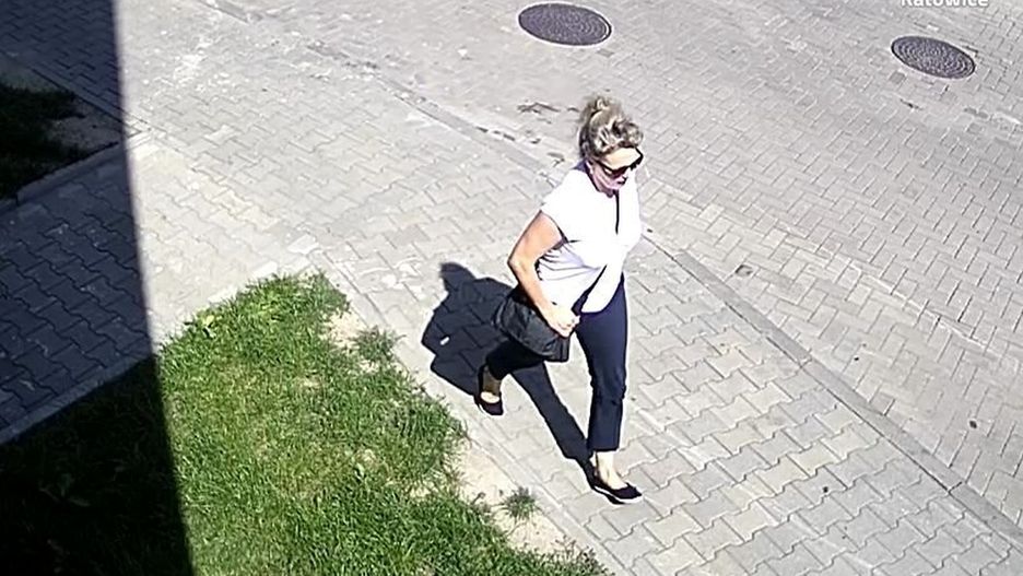 Policja z Katowic opublikowała zdjęcia. Na ujęciach, które zarejestrował monitoring, widać podejrzaną, jak idzie chodnikiem. Jest ubrana w białą bluzkę i ciemne spodnie.