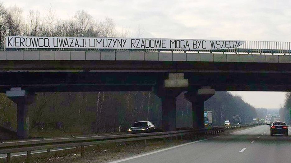 A tymczasem na Śląsku ostrzegamy !!! Patrzcie w lusterka limuzyny rządowe są wszędzie! - podpisał zdjęcie bannera jeden z mijających go kierowców.