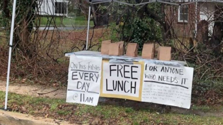 Jeśli jesteś głodny i potrzebujesz zjeść, zostawię dla ciebie kilka toreb ze zdrowymi posiłkami. Przygotowane z miłością przez mamę z sąsiedztwa w czystej i odkażonej kuchni – napisała "Mama z sąsiedztwa" na brezencie, którym osłoniła stół z jedzeniem.