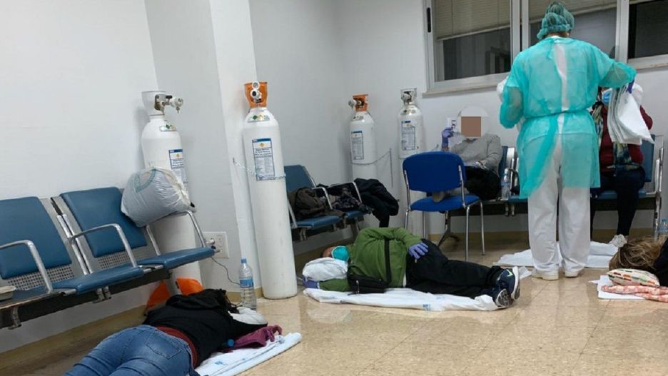 Chorzy leżeli na korytarzach, przyciśnięci do ścian. Na nagraniu z Infanta Leonor widać ogromny tłok: wszystkie miejsca siedzące są zajęte, a przestrzeń na podłodze pod ścianami okupują pacjenci szpitala, leżący na prześcieradłach. Słuchać kaszel, niektórzy chorzy mają maski tlenowe z butlami.