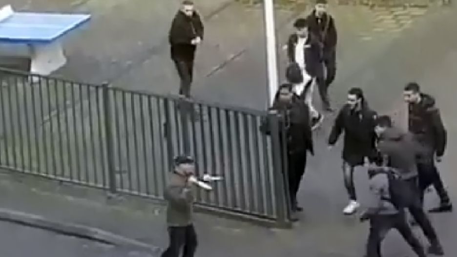 *Na filmie widać, jak gonią go w stronę bramy. *Gdy nożownik przewraca się, młodzi chłopcy kopią go. Gdy mężczyźnie udaje się wstać, obrywa plecakiem. Aktywnie broniące się nastolatki zmuszają go do ucieczki.