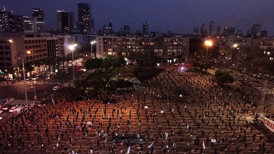 Według gazety Haaretz, w proteście zorganizowanym przez ruch "Czarna Flaga", wzięło udział ponad 2000 osób. Jednak z powodu nakazu trzymania odległości udało im się zająć cały, dość przestronny plac. Ruch sprzeciwia się m.in. nadzoru telefonów komórkowych obywateli co, według administracji ma chronić przez szerzeniem się pandemii oraz terroryzmem. W ich opinii, ubocznym skutkiem tych działań będzie większa kontrola władz nad obywatelami, która łatwo może być nadużywana.