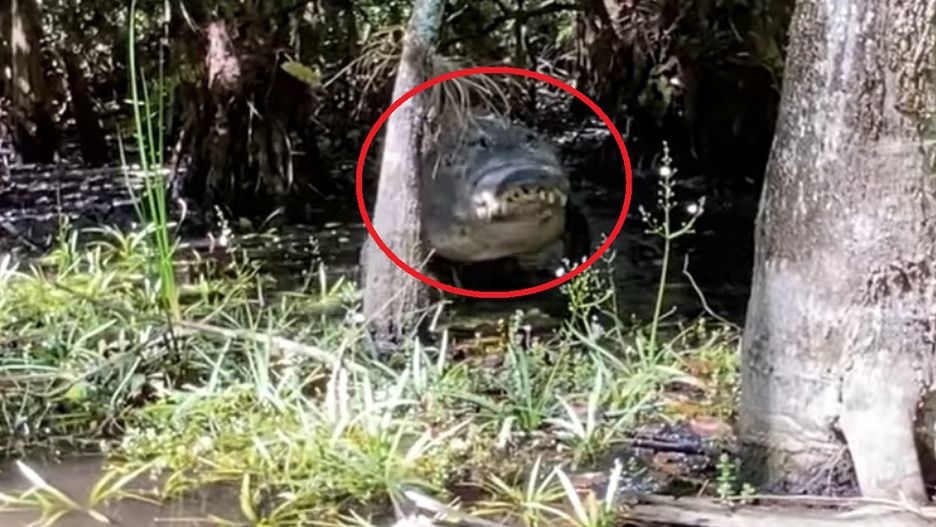 Conny Randolph uchwyciła na nagraniu niesamowite spotkanie z aligatorem. Widać na nim, jak drapieżnik wynurza się z bagna i zmierza w kierunku kobiety. Przewodniczka cofa się, a aligator syczy i ponownie zanurza się w bagnie.