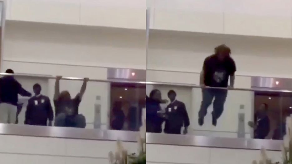 Dramatyczne sceny rozegrały się na galerii terminalu D lotniska Hartsfield-Jackson. Z niezrozumiałego powodu mężczyzna w podkoszulku podciągnął się nad barierką ochronną i spadł na podłogę poniżej. Po drodze w dół odbił się od betonowej konstrukcji kwietnika.
