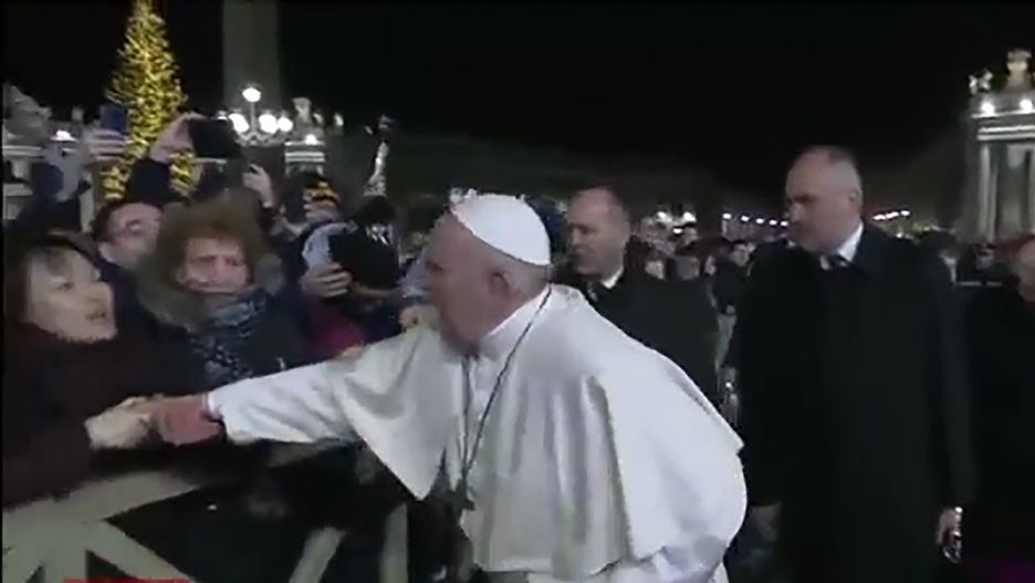 Incydent miał miejsce 31 grudnia 2019 roku na placu św. Piotra. Świat obiegło nagranie, na którym widać, jak papież Franciszek bez skutku próbuje się wyswobodzić z uścisku jednej z wiernych. Kobieta puściła rękę papieża dopiero po tym, jak zdenerwowany Franciszek uderzył ją w dłoń.