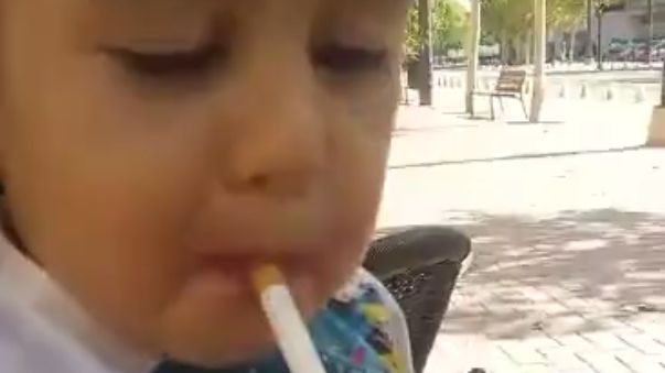 Na filmie widzimy dwóch siedzących w ogródku piwnym mężczyzn podających chłopcu używki. Jeden z nich, prawdopodobnie jego ojciec, wkłada mu papierosa do ust i pozwala pić piwo. Chłopiec ma prawdopodobnie około dóch lat.