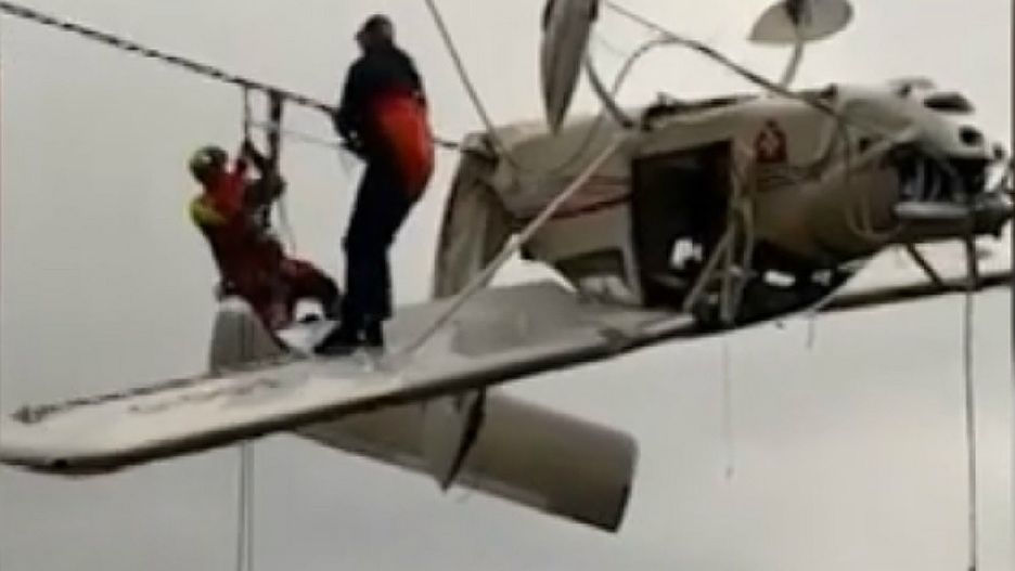 Dramatyczne nagranie. Na filmie z miejsca wypadku widać zaplątany w kable samolot i dwie przebywające na skrzydle osoby. Jedna z nich to pasażer, a druga ratownik, który pomaga mu zejść na ziemię - poinformowała agencja ANSA.