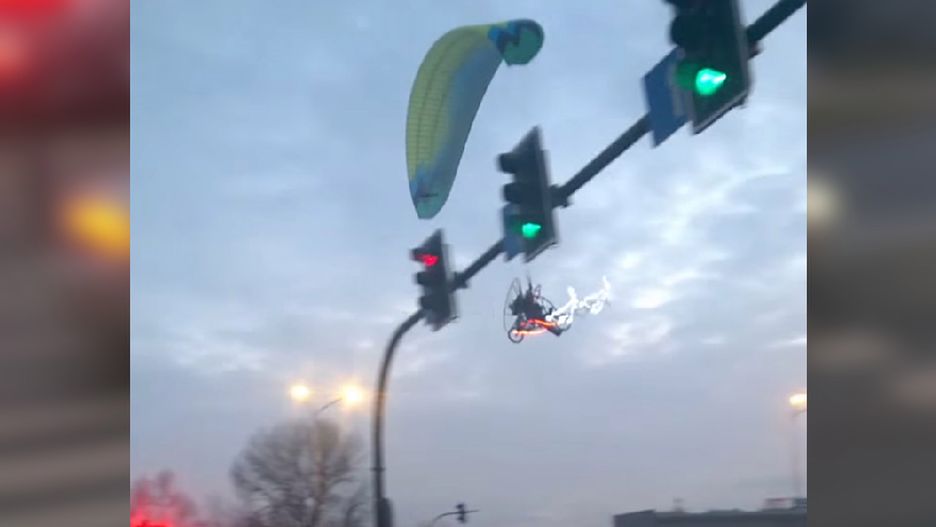 Na Rybitwach w Krakowie człowiek czekający na przejściu dla pieszych nagrał nisko lecącego św. Mikołaja. Teraz lotnika szuka tamtejsza policja.