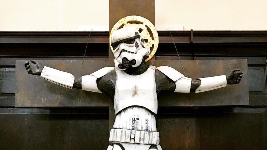 Kontrowersyjna figura zawisła w londyńskim kościele St. Stephen Walbrook. W zabytkowej świątyni organizowana jest wystawa charytatywna – informuje The Art Newspaper. Pomysł nie spodobał się jednak parafianom, a proboszcz musiał przenieść ukrzyżowaną postać z Gwiezdnych Wojen.