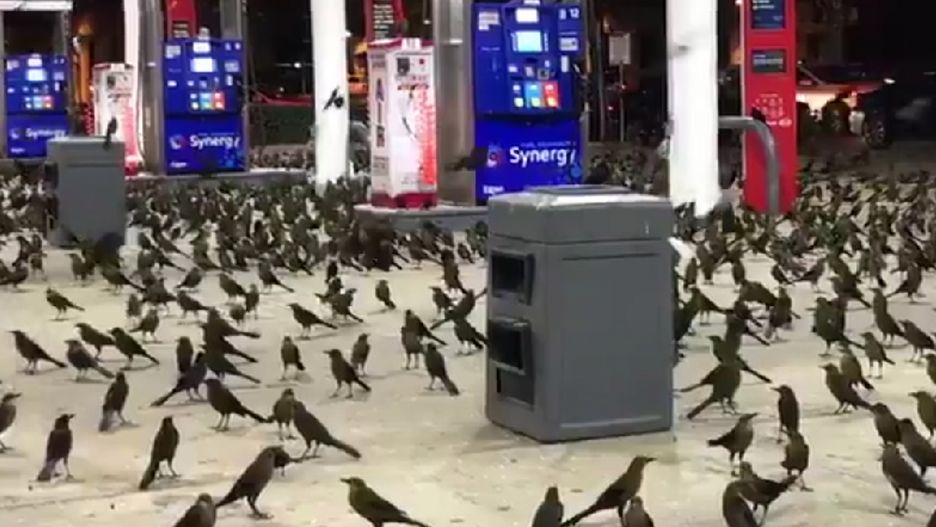 Lokalna dziennikarka nagrała dziwne zachowanie ptaków. Christine Dobbyn tankowała tam wiele razy, ale czegoś takiego nie widziała nigdy.