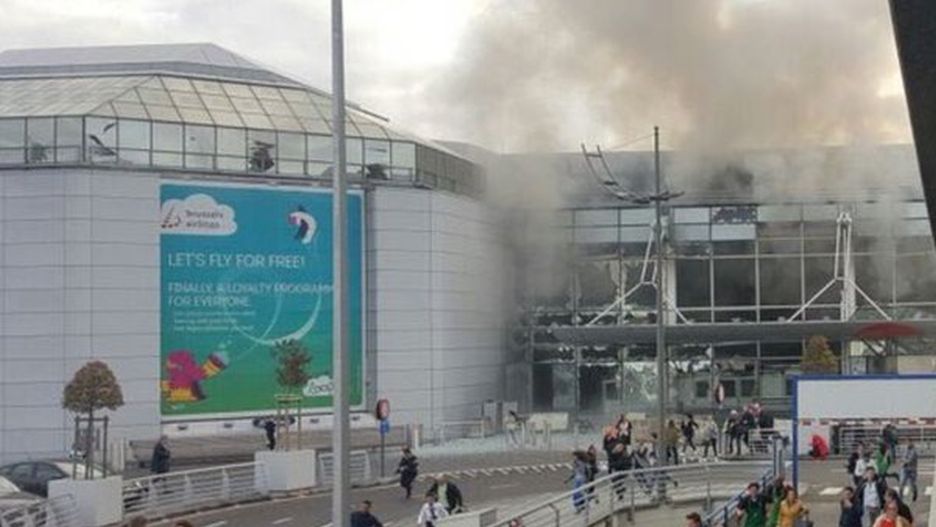 Do pierwszych dwóch eksplozji doszło w hali odlotów. Według świadków tragiczne zdarzenie miało miejsce około godziny 8 w punkcie odprawy American Airlines. Belgijska agencja prasowa Belga, powołując się na relacje świadków, podaje, że przed wybuchami padły strzały. Było także słychać krzyki w języku arabskim. Telewizja VRT podała, że na lotnisku doszło do ataku zamachowca samobójcy.