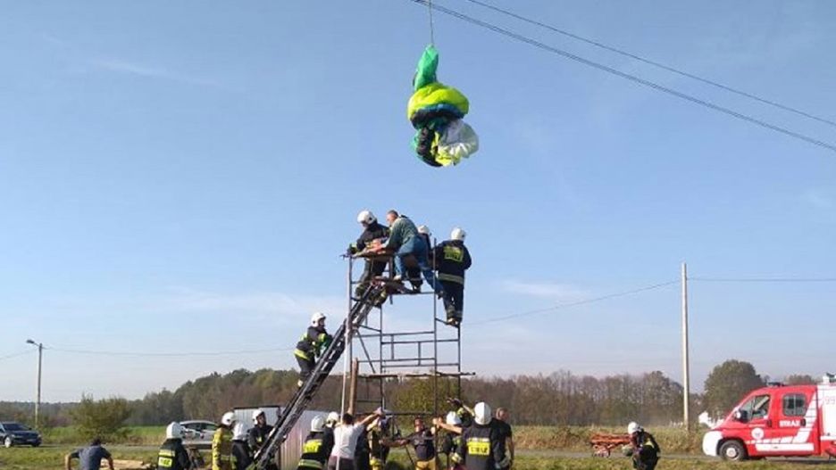 Paralotniarz zawisł na linii średniego napięcia w miejscowości Zasole Bielańskie w woj. śląskim. Na miejsce wypadku przyjechała straż pożarna, która zdjęła mężczyznę z przewodów za pomocą rusztowania.