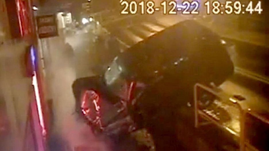 Nie żyje 79-letni kierowca jeepa, który z olbrzymią siłą staranował barierki i wbił się w ścianę budynku. Nagranie z miejskiego monitoringu ujawnia, że pewnej śmierci cudem uniknęła grupa pieszych.