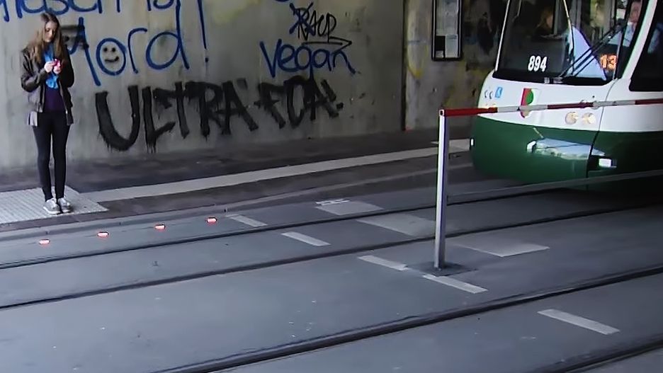Użytkownicy smartfonów nie zwracali uwagi na ciche tramwaje elektryczne. Wchodzili na tory z opuszczoną głową wprost pod nadjeżdżający pojazd. By temu zaradzić, miasto zainstalowało w chodniku czerwone migające światełka. Ich zadaniem jest rozpraszanie uwagi użytkownika telefonu.