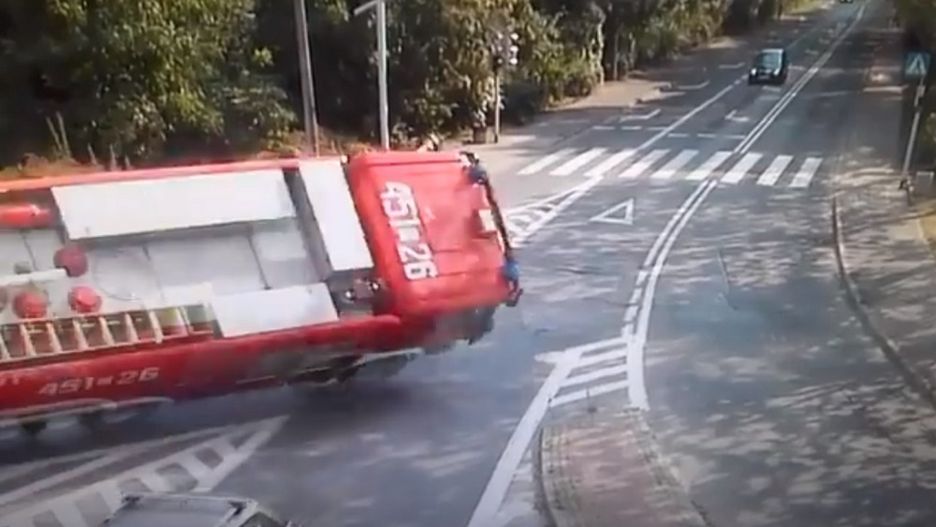 Gliwice. Wóz strażacki w czasie skrętu przewrócił się na bok. To wyglądało bardzo groźnie, ale na szczęście nikomu nie stało się nic poważnego.
