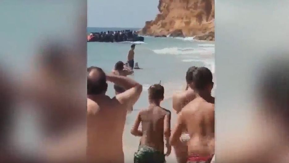 *Po szturmie na plażę migranci wspięli się na klif i zniknęli. *Na filmie słychać, jak jedna z obserwujących zajście osób krzyczy po hiszpańsku, że kierują się w stronę luksusowego hotelu Sancti Petri Melia.
