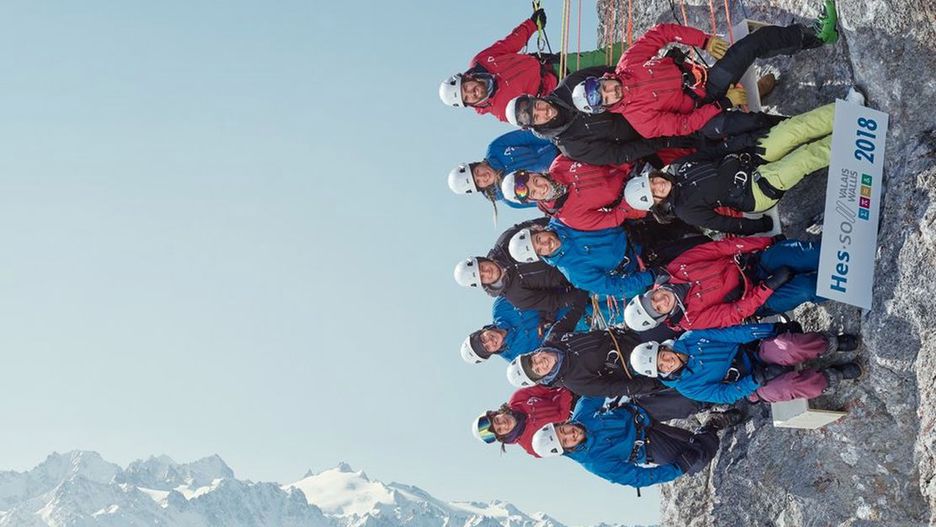 Wyjątkową fotografię wykonali studenci ze szwajcarskiego uniwersytetu HES-SO. Pozowali na wysokości 2400 m. n.p.m. Jakby tego było mało, ustawili się pod kątem 90 stopni do podnóża góry.