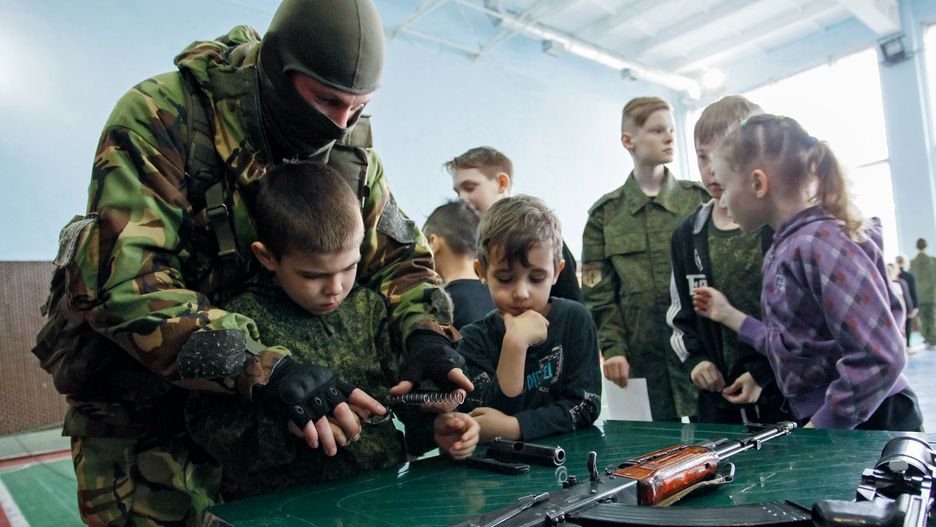 Oficjalnie Moskwa zaprzeczała, by żołnierze regularnej armii brali udział w wojnie na wschodzie Ukrainy. Prezydent Władimir Putin kpił publicznie, że być może to "zielone ludziki" zaatakowały sąsiada. W Ługańsku władzę sprawują w tej chwili separatyści (na zdjęciu powyżej szkolenie ługańskich uczniów z posługiwania się bronią prowadzone przez członka sił rebeliantów).