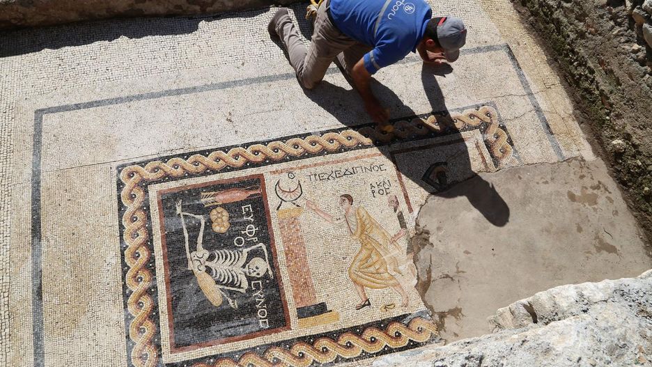 Znaleziona w Turcji mozaika przedstawia kościotrupa siedzącego z dzbanem wina i bochenkiem chleba. Obok niego widać napis po grecku, który mówi: "Raduj się i ciesz się życiem".