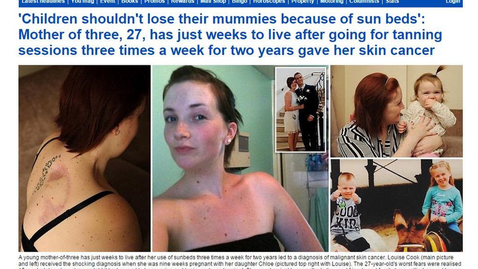 Louise Cook była regularnym klientem solarium i zaglądała tam przynajmniej trzy razy w tygodniu. Najpierw aplikowała sobie sesje sześcio-, a później dziewięciominutowe. 27-latka została zaskoczona szokującą diagnozą o raku kiedy była zaledwie w 10. tygodniu ciąży. Postanowiła jednak nie usuwac ciąży. Jej córeczka Chloe urodziła się zdrowa.