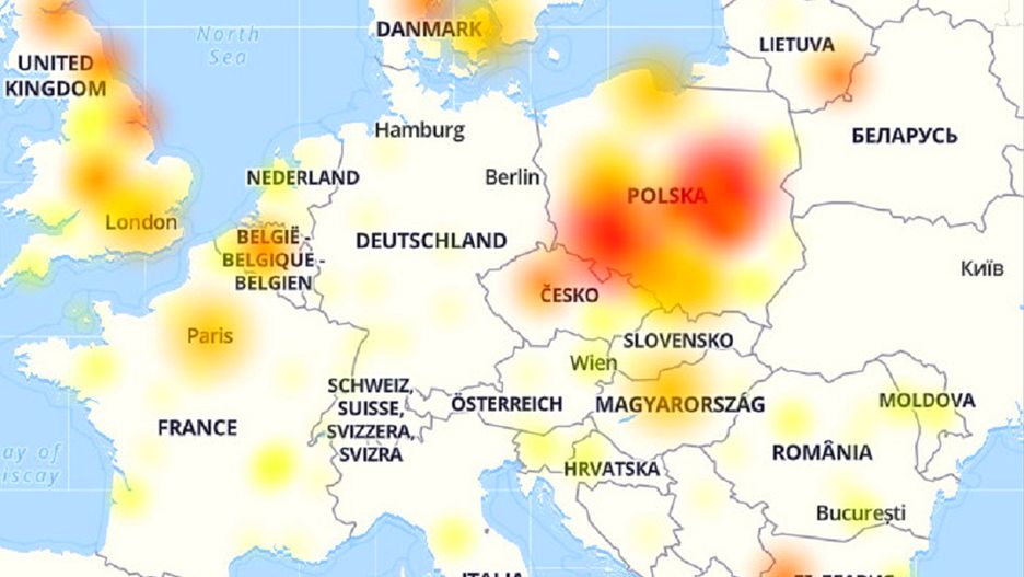 Polacy masowo alarmowali o problemach. Zgłoszeń było nawet kilkanaście tysięcy na minutę. Można było je śledzić w serwisie DownDetector. Problemy rozpoczęły się w poniedziałek wieczorem. Poniższa mapka pokazuje, w których krajach Europy była najgorsza sytuacja.