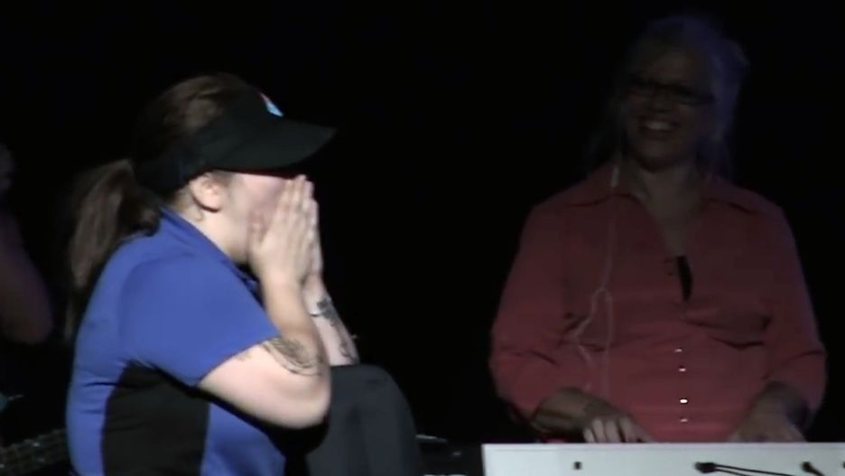 Lekko onieśmielona słucha, zakrywa usta w szoku, wybucha płaczem a wierni biją brawo.
