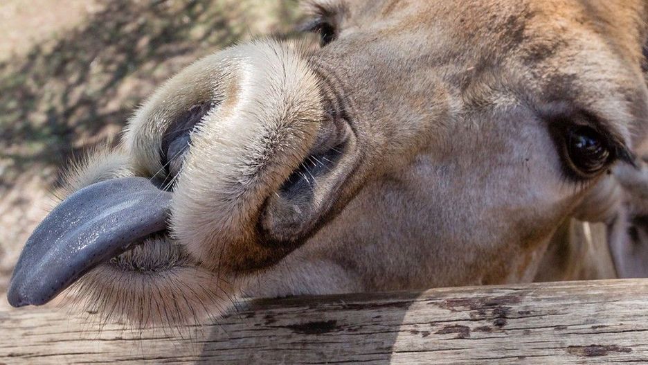 Chętni na karmienie goście parku muszą wejść na specjalną platformę. Wszystko z powodu rozmiarów zwierzęcia, wyposażonego w bardzo długie nogi i szyję. Oprócz oczywiście widocznego na pierwszym planie języka, uwagę zwracają długie rzęsy żyrafy - potrzebne są jej one, aby chronić jej oczy przed piaskiem, występującym w naturalnym środowisku życia zwierzęcia.