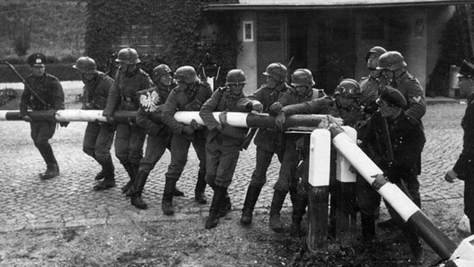 "Cześć i chwała bohaterom". Na ubraniach widać kadr z nazistowskiej kroniki propagandowej, a na nim niemieckich żołnierzy, którzy z uśmiechami łamią szlaban graniczny w pierwszym dniu kampanii wrześniowej w 1939 r.