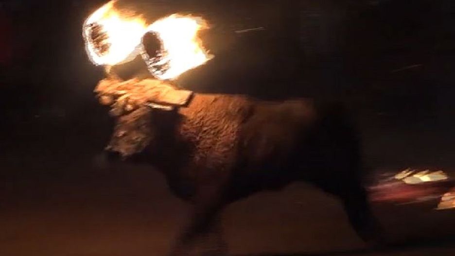 Byk biega nerwowo, próbując zgasić ogień płonący nad jego głową. Wszystkiemu przygląda się ok. 1500 widzów, którzy są zafascynowani cierpieniem zwierzęcia.