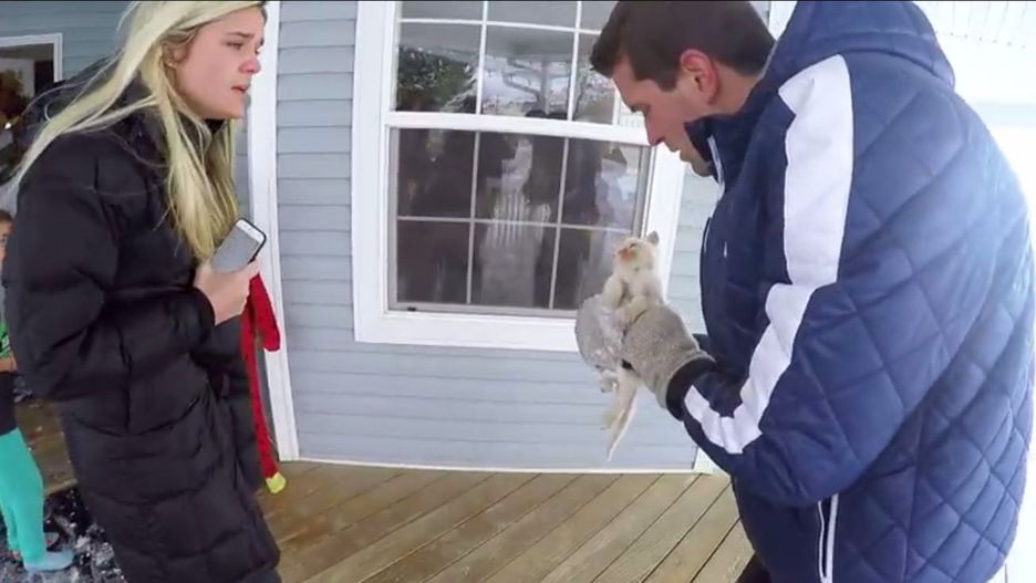 *Początek tej historii nie napawał optymizmem. *Kiedy rodzina wybiegła przed posesję, wszyscy byli w świetnych humorach, tarzali się w białym puchu i rzucali śnieżkami. Po chwili jednak starszy syn Brandena Justin pobiegł w kierunku czegoś, co leżało w zaspie obok domu. Okazało się, że to mały kotek. Syn pognał w kierunku zaspy i delikatnie wyjął zwierzę z lodowatego puchu.