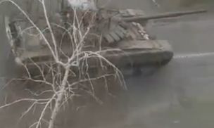 Czołgi przejeżdżają przez Tokmak. Jeden z nich został trafiony i płonie