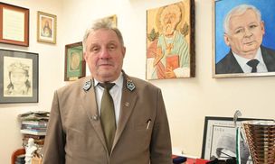 Dyrektor Lasów Państwowych pozuje w gabinecie. Uwagę przykuwa jedno