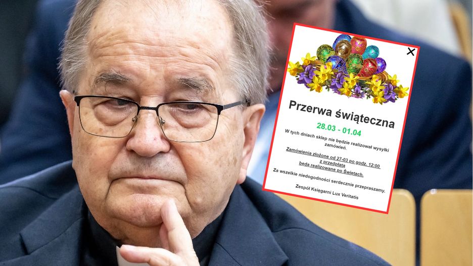Przerwa świąteczna 28.03 - 01.04. W tych dniach sklep nie będzie realizował wysyłki zamówień. Zamówienia złożone od 27-03 po godz. 12:00 z przedpłatą będą realizowane po Świętach. Za wszelkie niedogodności serdecznie przepraszamy. Zespół Księgarni Lux Veritatis" - czytamy na banerze, który wyświetla się za każdym razem, gdy wejdziemy na stronę lub podstronę sklepu internetowego Ojca Rydzyka.