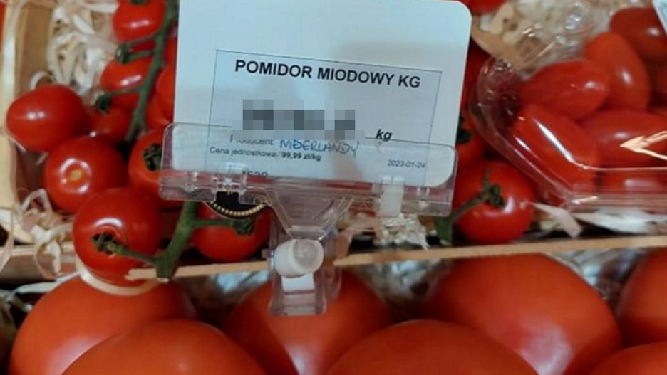Jak widzimy na plakietce pomidory są sprowadzone z Holandii. Internauci łapią się za głowę, skąd tak kosmiczna cena pomidorów.
