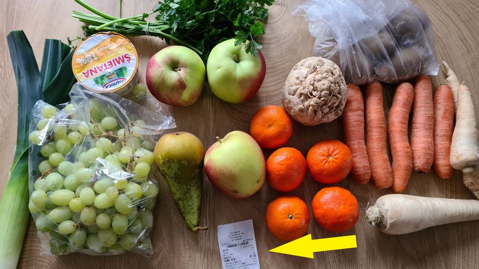 Zakupy w osiedlowym warzywniaku: 1 por, 1 seler, 4 marchewki, 3 pietruszki, 5 mandarynek, 1 gruszka, 3 jabłka, 5 ziemniaków, winogrona, śmietana, natka pietruszki. 61 zł - napisał autor postu na Twitterze.