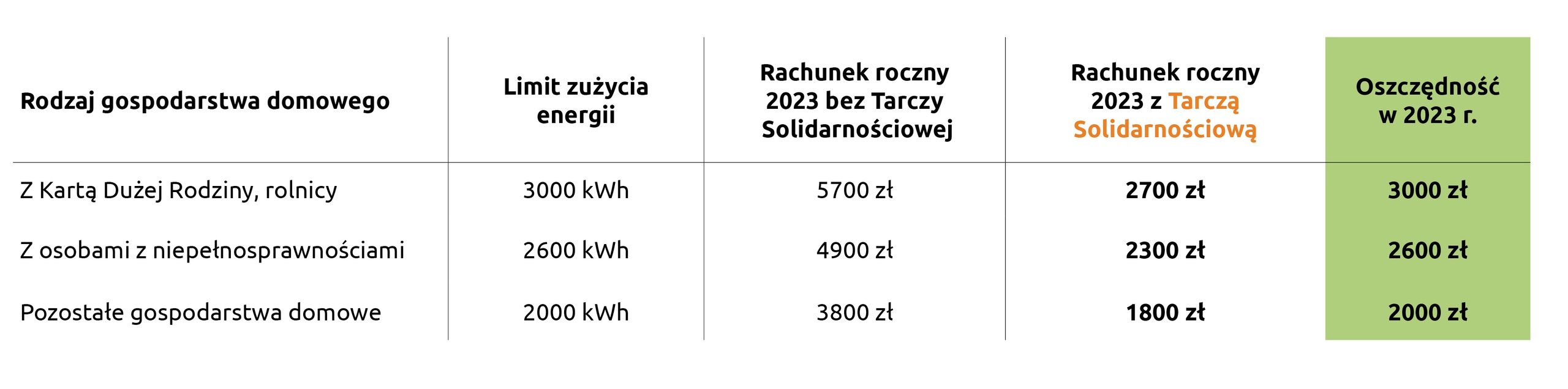Przykładowo, bez rządowych działań osłonowych 5-osobowa rodzina przy rocznym zużyciu energii elektrycznej na poziomie 3000 kWh w 2023 r. zapłaciłaby 5700 zł. Dzięki Tarczy Solidarnościowej jej rachunek wyniesie 2700 zł. W przypadku gospodarstwa domowego z osobami niepełnosprawnymi (zużycie 2600 kWh) będzie to oszczędność rzędu 2600 zł (2300 zł zamiast 4900 zł), a pozostałych gospodarstw (2000 kWh) – 2 tys. zł (1800 zł zamiast 3800 zł).
