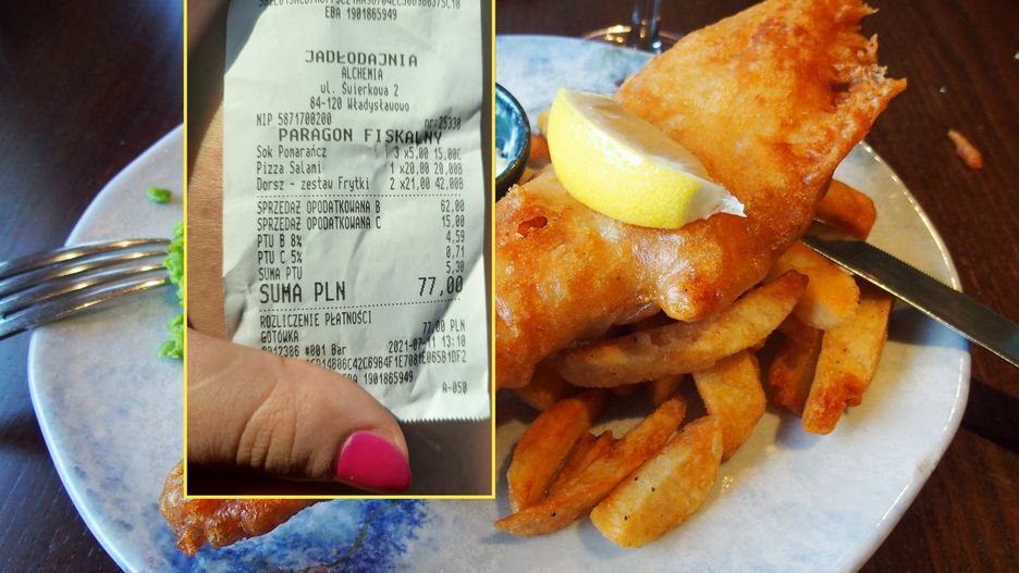 Z załączonego do wiadomości zdjęcia paragonu widać, że pani Kasia i jej towarzysze zamówili pizzę z salami za 20 zł oraz dwie porcje dorsza w zestawie z frytkami za jedynie 21 zł. Do tego trzy soki pomarańczowe.