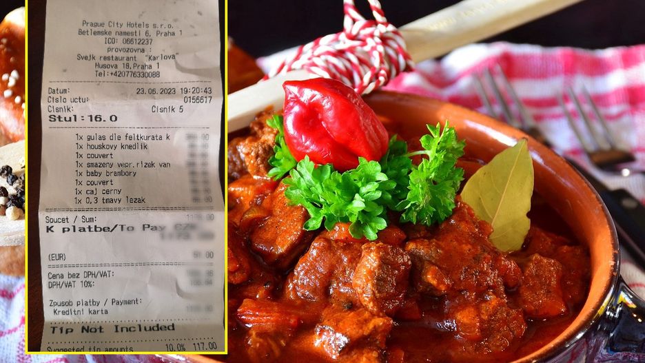 Do wiadomości załączono zdjęcie paragonu. Widać na nim, że za gulasz zapłacono 390 czeskich koron, czyli około 69 zł, a za knedlika, który był dodatkiem, 69 koron, czyli 12 złotych.