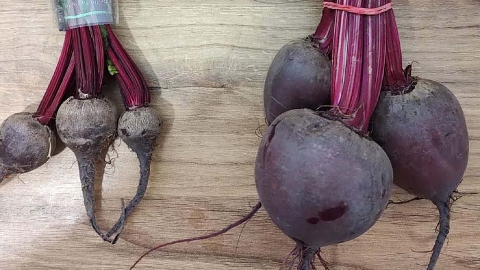 Po lewej stronie zdjęcia pokazał botwinkę z dyskontu, po prawej - lokalnego warzywniaka.