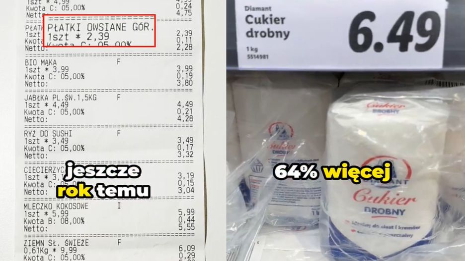 Płatki owsiane górskie jeszcze rok temu kosztowały w Lidlu 2,39 zł, obecnie kosztują 2,85 zł. Cukier rok temu kosztował 3,95 zł za kilogram, teraz trzeba za niego zapłacić 6,49 zł, czyli o 64 proc. więcej - wylicza dietetyk.