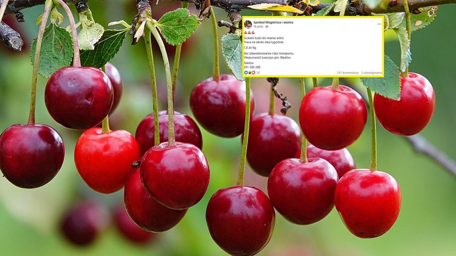 W mediach społecznościowych na profilu "Spotted Mogielnica i okolice" (woj. mazowieckie) pojawiło się ogłoszenie. Jeden z przedsiębiorców szukał ludzi do rwania wiśni. Praca ma trwać ok. dwóch tygodni. Pracodawca nie oferuje zakwaterowania i transportu, należy dojechać na własną rękę do miejscowości Łaszczyn w gminie Błędów.